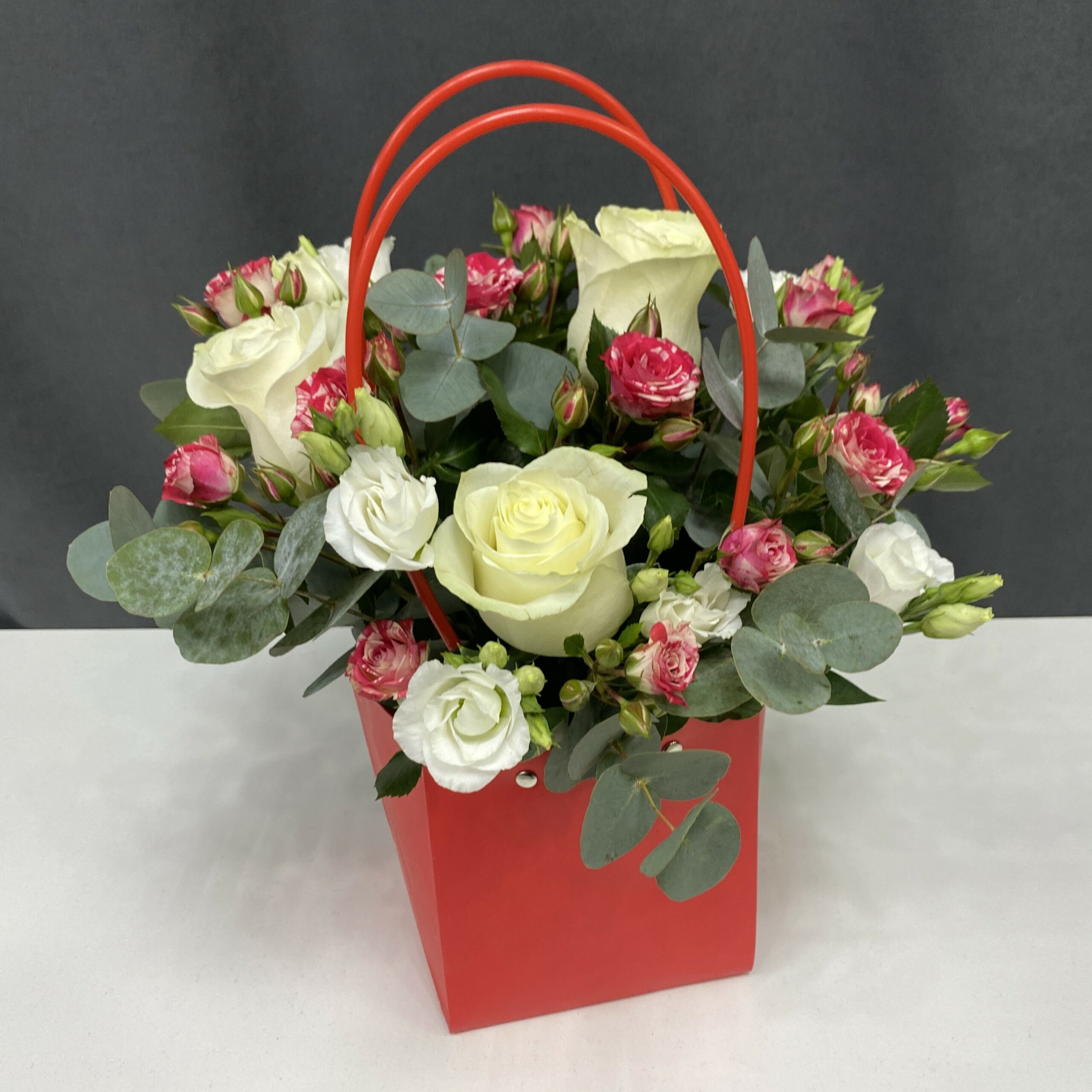 Эта композиция в элегантной сумке-кашпо – идеальное сочетание энергии и утонченности для тех, кто ценит смелые контрасты и глубокий символизм. Сочетание благородных белых роз Мондиаль, ярких роз Фаер Воркс и нежных эустом создает динамичную композицию, где страстные красные оттенки гармонично сочетаются с кристальной белизной и серебристой зеленью, даря ощущение гармонии и вдохновения.