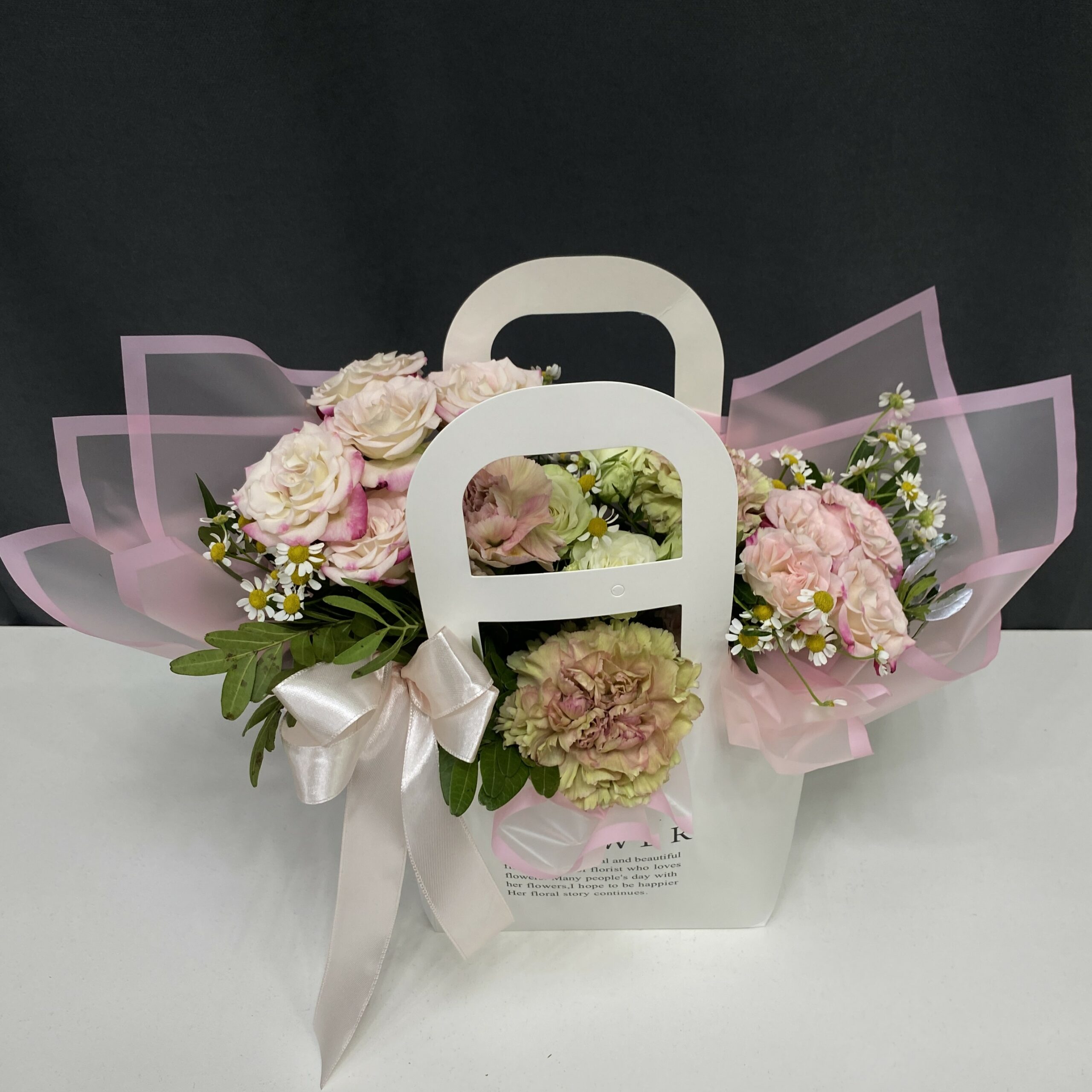 Эта композиция в стильной сумке-кашпо – идеальное сочетание природной элегантности и современного дизайна для тех, кто ценит сложность простых форм. Сочетание мраморных гвоздик, изящных роз Рефлекс, экзотического Грин Глоу и ажурной зелени создает многоуровневую композицию, где нежные пастельные тона гармонично переплетаются с серебристо-зелеными оттенками, даря ощущение свежести и умиротворения.
