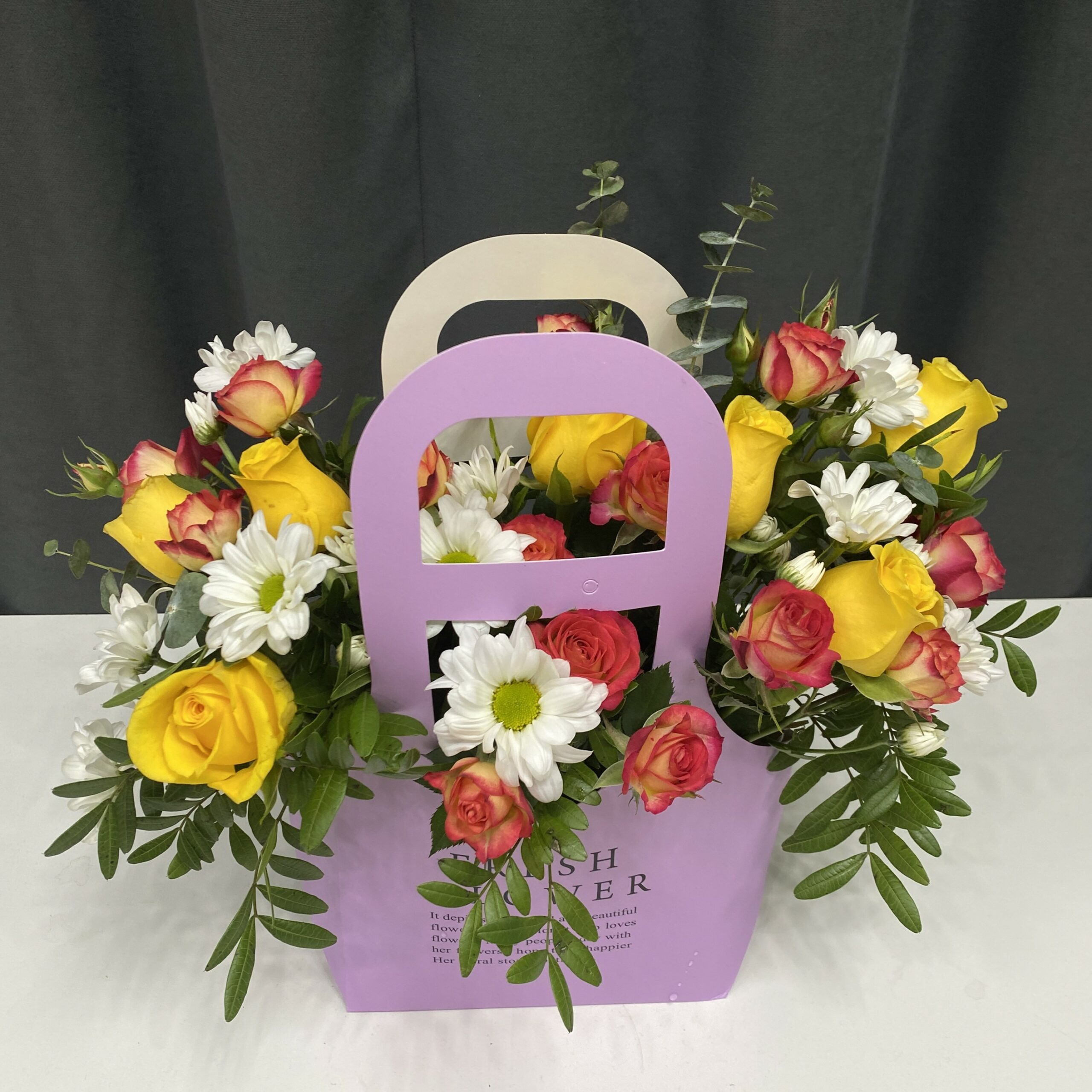 Состав: Фисташка, Кустовая роза красно-желтая – 3 шт, Роза желтая (Кения) 40см – 7 шт, Хризантема кустовая белая – 1 шт, Упаковка (дизайнерская пленка), Оазис, Плайм пакет.