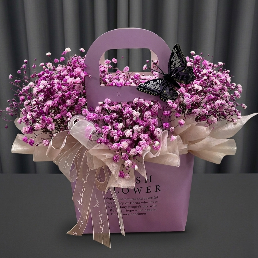 Состав: Гипсофила розовая – 5 шт, Лента (атласная), Упаковка (дизайнерская пленка), Декор (бабочка), Плайм пакет, Оазис.