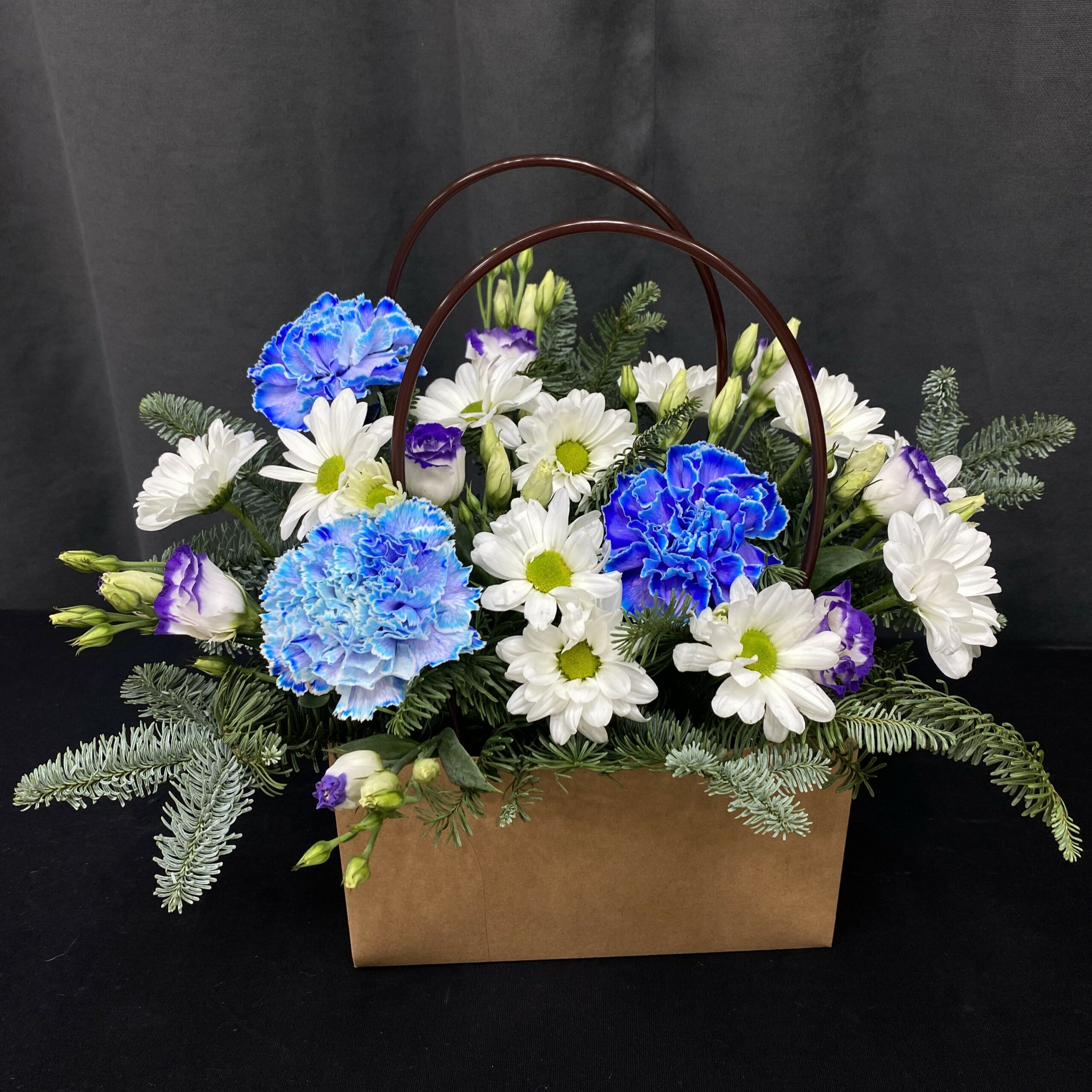 Состав: Нобилис, Диантус крашеный – 3 шт, Хризантема кустовая белая – 2 шт, Эустома бело-синяя (лизиантус) – 2 шт, Упаковка (дизайнерская пленка), Оазис, Плайм пакет.